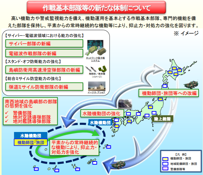 宇宙軍のような独立した軍種は設けず、陸自では電子戦・サイバー部隊の新編、空では宇宙監視部隊の創設など、既存のフォースプロバイダーが新たな領域での作戦遂行能力を整備する。