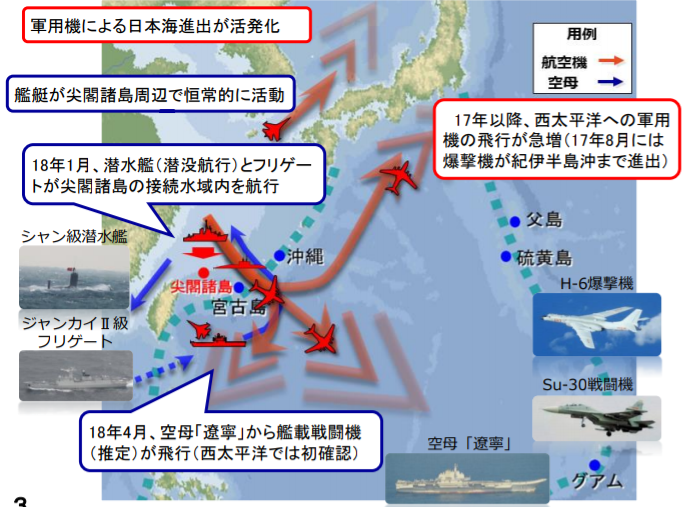 しかし、爆撃機の活動活発化や空母の戦力化に伴い、中国軍がいわゆる第2列島線への進出を進めた結果であろう。
