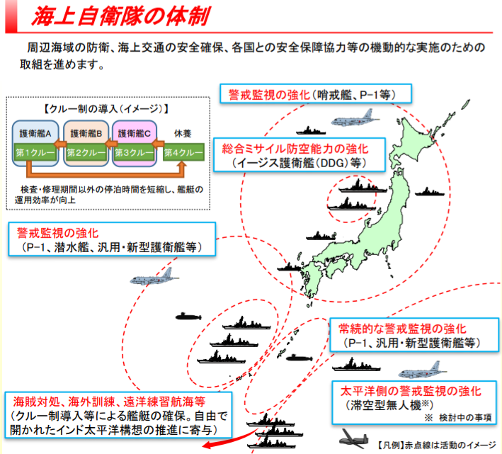 海上自衛隊は新たな護衛艦(FFM)や哨戒艦の建造などを行う。特にFFMは従来の護衛艦の任務を遂行しつつ、機雷戦など水陸両用作戦への適応が図られている。