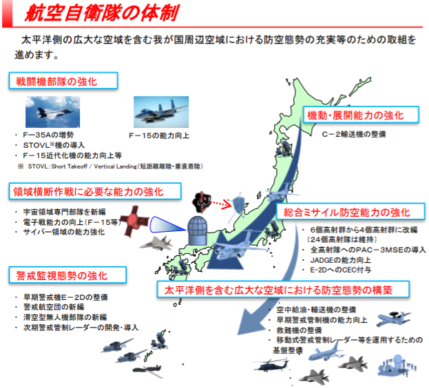 戦闘機は航空戦力の中核であり、F-35を147機導入するほか、F-15Jの近代化改修も行う。